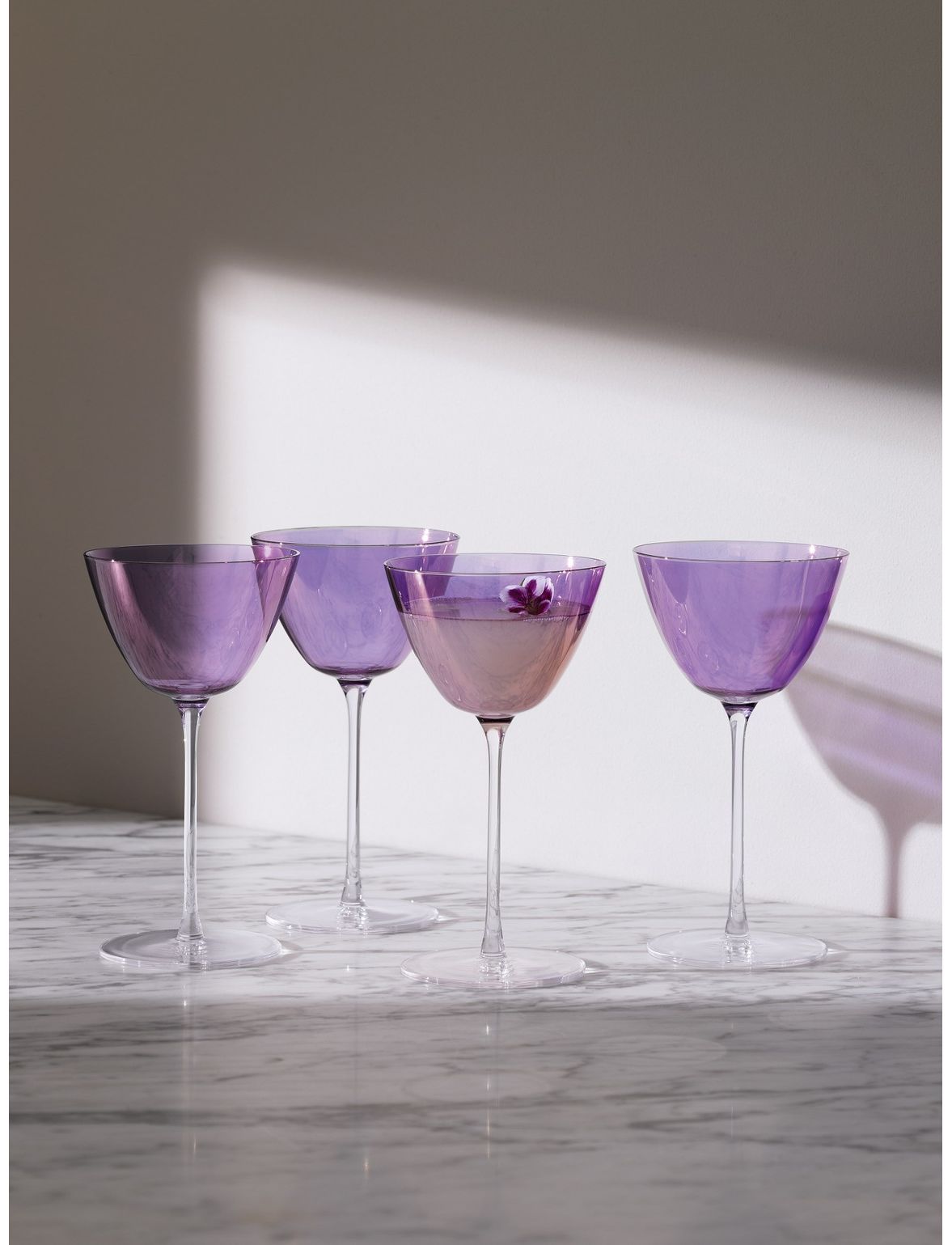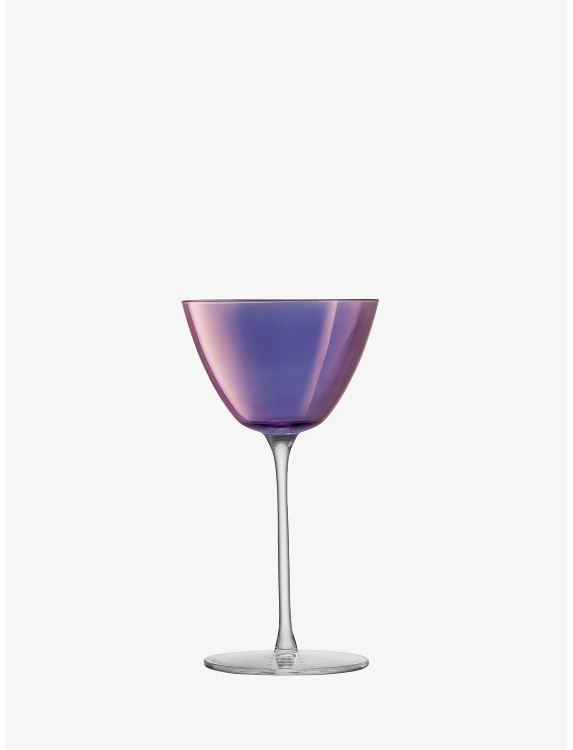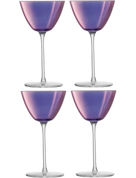 Набір із чотирьох сучасних келихів для мартіні, розписаних вручну фіолетовим блиском, натхненним райдужними кольорами північного сяйва. Підходить для коротких коктейлів, таких як мартіні, манхеттен і гімлет.