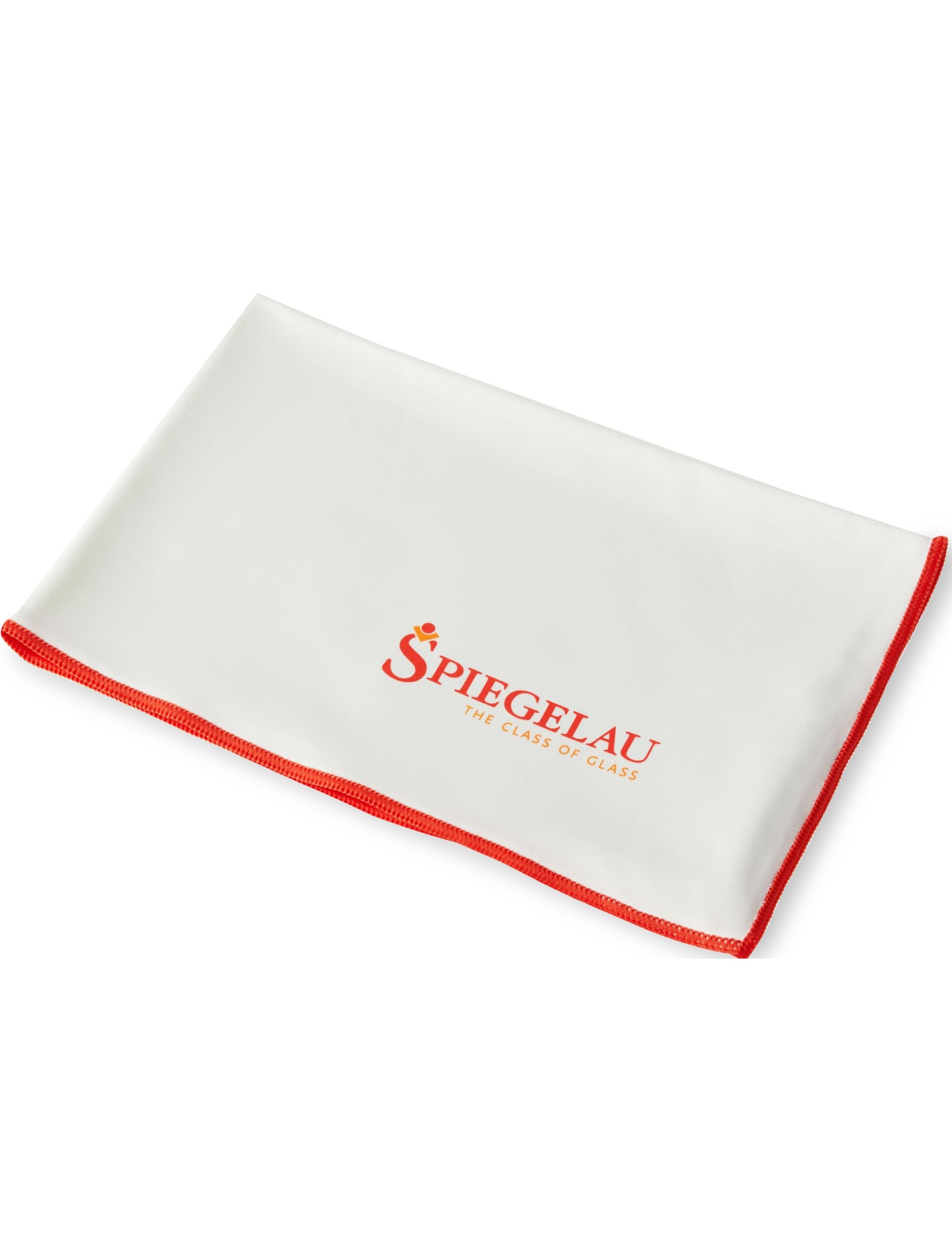 Серветка для полірування з мікрофібри розміром 50x64 см біла, з червоним краєм і має логотип SPIEGELAU у нижньому правому куті.