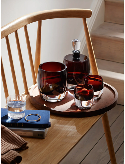 Пара сучасних вигнутих склянок для віскі. Потрібна професійна майстерність, щоб помістити коричневе скло в прозорий шар і створити вагому основу кожного стакана.