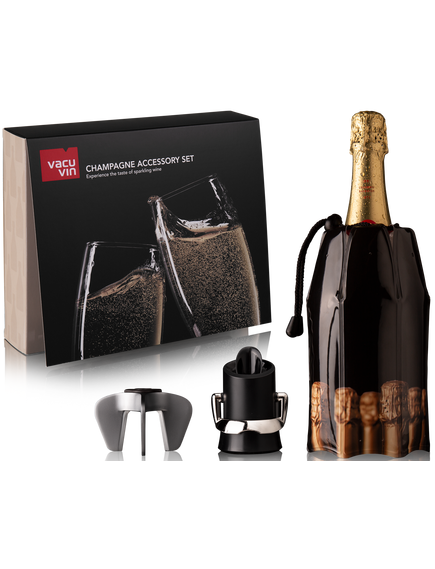 Набір аксесуарів для шампанського Vacu Vin містить 3 аксесуари для шампанського, щоб відкривати, охолоджувати, подавати та зберігати ваше шампанське. Це ідеальний подарунок для кожного любителя шампанського. Подарункова коробка збирається та упаковується на нашому підприємстві соціального виробництва в Нідерландах.