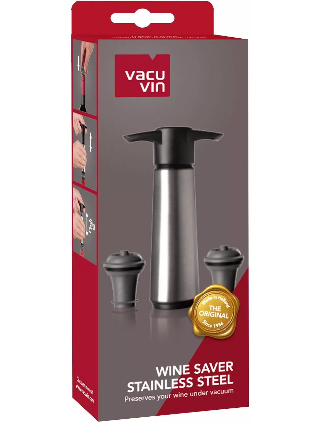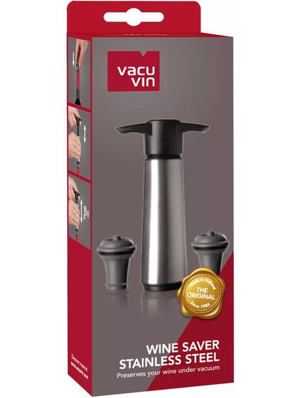 Original Vacu Vin Wine Saver є основним продуктом вдома з 1986 року. Wine Saver створює вакуум, щоб запобігти окисленню відкритої пляшки вина, завдяки чому вона зберігається до 10 днів.