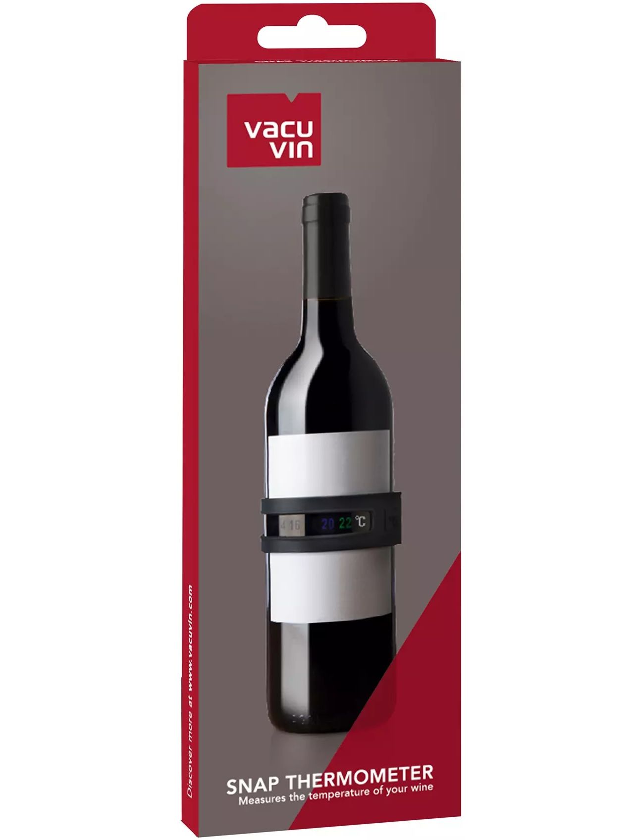 Термометр Vacu Vin Snap показує температуру ваших пляшок вина, щоб подавати ваше вино при правильній температурі. Ви можете легко скласти термометр навколо будь-якої пляшки вина. Дисплей на термометрі покаже поточну температуру пляшки в градусах Цельсія і Фаренгейта (в залежності від придбаної версії). На задній частині термометра ви знайдете рекомендовану температуру подачі для різних вин. Компактний і легкий дизайн термометра Vacu Vin Snap робить його легким у транспортуванні, зручним у використанні та зберіганні. Ідеальний гаджет для ентузіастів вина!