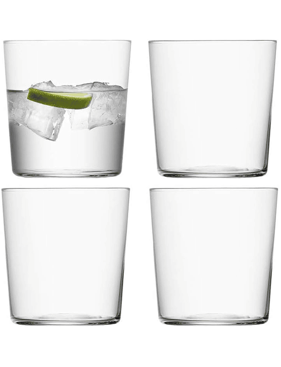 Набір із чотирьох низьких сучасних стаканів із тонкими стінками та дизайном, який можна штабелювати. Універсальний стакан для води, соку та вина або використовуйте як миску для подачі оливок, горіхів і десертів.