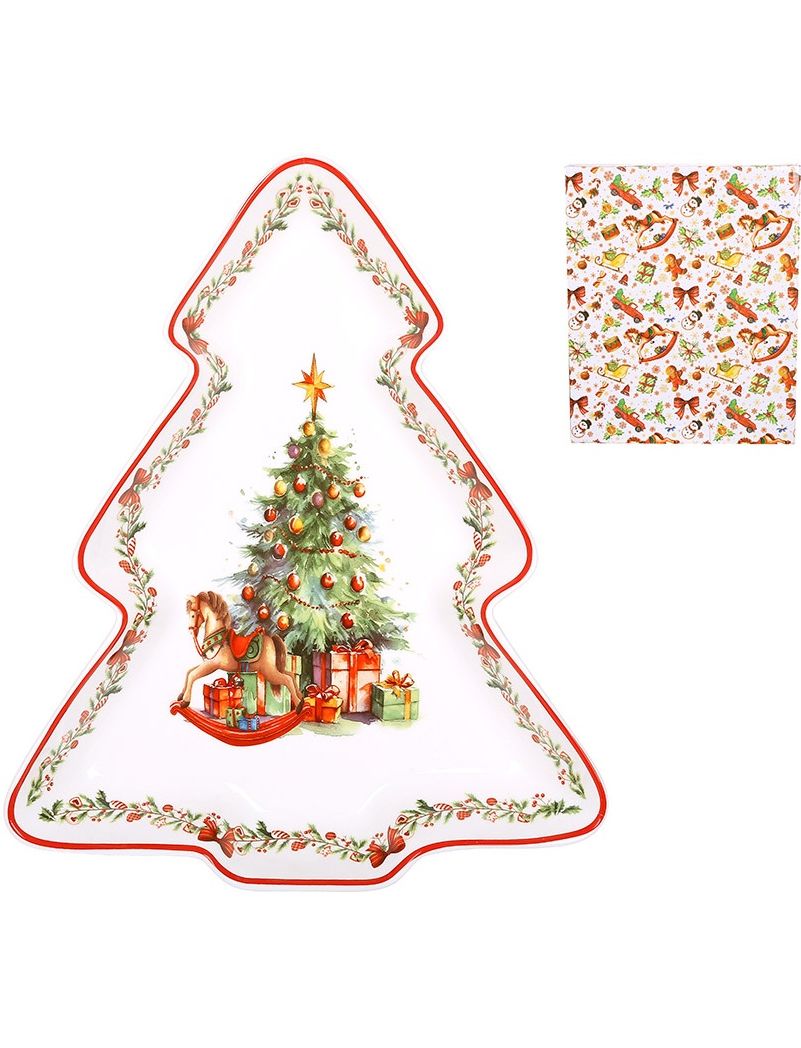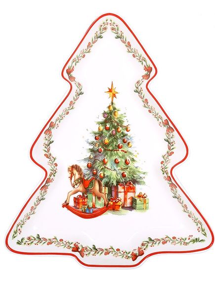 Це яскраве новорічне блюдо у формі ялинки створене для того, щоб прикрасити ваш стіл і наповнити атмосферу святковим теплом. У центрі — традиційний сюжет із ошатною ялинкою, подарунками та дерев’яним коником-гойдалкою. Оформлення поєднує класичні новорічні символи, що ідеально вписуються у зимовий декор.