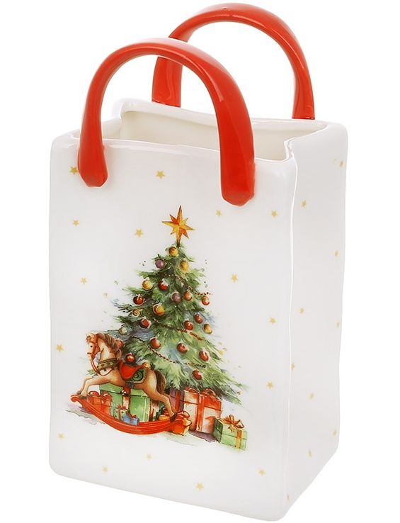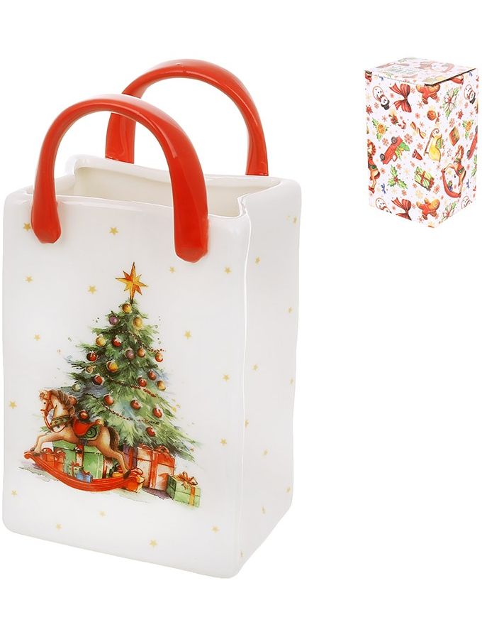 Ця підставка — не просто декоративний елемент, а справжній помічник у створенні організованого і водночас казкового простору. Виготовлена з якісної порцеляни, вона має вигляд святкової сумочки з об’ємними червоними ручками. На передній частині — ілюстрація класичної різдвяної сцени: розкішна ялинка з прикрасами, подарунки та іграшковий коник-гойдалка.