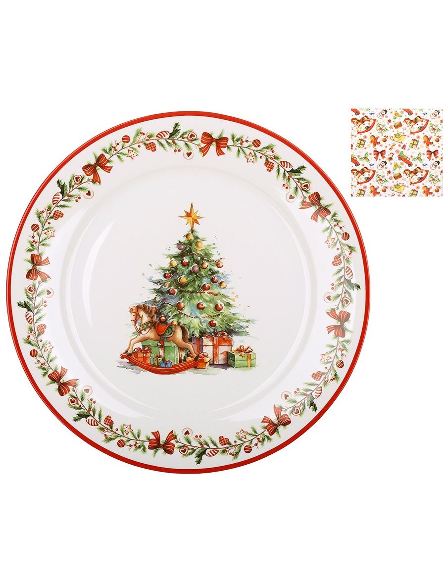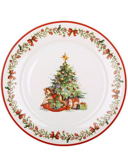 Ця святкова обідня тарілка виконана з високоякісної порцеляни та оздоблена улюбленим зимовим сюжетом. У центрі — ошатна ялинка з кульками й подарунками, біля якої стоїть дерев’яний коник-гойдалка. Край прикрашений вінком із ялинових гілочок, бантиків, пряників, льодяників і ягід — усе це обрамлено витонченою червоною смугою, що додає тарілці виразності.