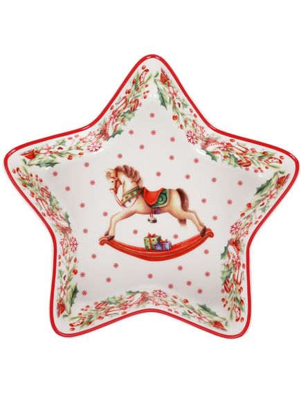 Цей незвичайний салатник у формі зірки — справжня окраса святкової сервіровки. Створений у стилі серії «Коник», він прикрашений атмосферним зимовим сюжетом: ошатна ялинка, подарунки та класичний дерев’яний коник. Декор навколо краю поєднує вінтажні мотиви — гілочки, цукерки, бантики, що підкреслює чарівність зимових свят.