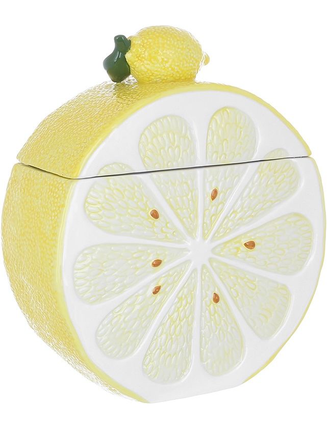- Форма: Унікальна форма лимона, яка робить банку не лише зручним предметом для зберігання, а й елегантним декором.