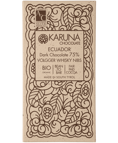 Склад: какао-боби*, необроблений тростинний цукор*, какао-крупка*, какао-масло*, віскі (3,2%). *З органічного сільського господарства. Ми виготовляємо темний шоколад із 75% вмістом шоколаду, замочуємо какао-крупку у віскі, сушимо її та посипаємо нею задню частину плитки. Віскі дистилюється...