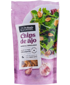 Він смачний, хрусткий і готовий до вживання. Ідеально підходить для грильованого м’яса чи риби, піци, соусів, а також як хрустка добавка до салатів, кремів та супів. Спробуйте його як завершальний штрих до тапас та пінчос. Склад: подрібнений часник та оливкова олія з органічного землеробства.