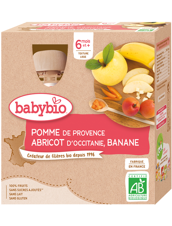 У малюка душа гурмана? Познайомте його зі смачною сумішшю фруктів за допомогою цієї маленької пляшки. Прованське яблуко та оксітанський абрикос тонко поєднуються з еквадорським бананом, утворюючи вершкове фруктове пюре. Цією трійкою смачних фруктів ви точно порадуєте дитину!