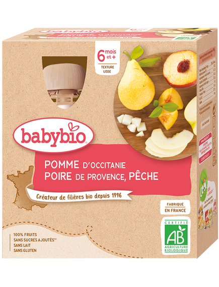 Смачні оксітанські яблука та соковиті прованські груші, які просто супроводжуються чудовими персиками. Усе, об’єднане в солодке пюре, зосереджено в пляшці, щоб брати її куди завгодно для найбільшого задоволення дитини.
