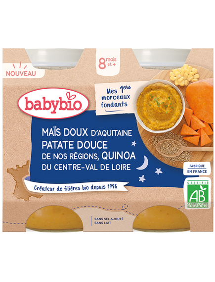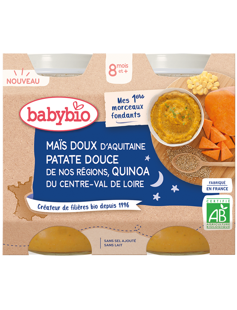 Починаючи з 8 місяців, пробудіть почуття малюка за допомогою оригінального рецепту крему, що містить справжні шматочки, що тануть. Їхні смакові рецептори оцінять цю чудову комбінацію солодкої кукурудзи з Аквітанії, солодкої картоплі з наших регіонів і кіноа з Центру Валь-де-Луар. Маленький додатковий? Знайдіть у цьому горщику цукіні, вирощені на нашій фермі Babybio.