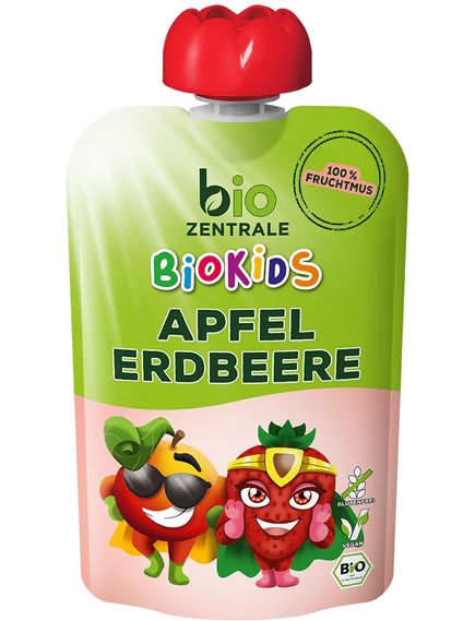 Наше яблучно-полуничне фруктове пюре BioKids на 100% складається з фруктів і не містить цукру**. Кремова кремова консистенція та фруктовий смак готових до збору яблук і полуниці роблять фруктове пюре BioKids у практичному пакеті для стискання ідеальним супутником у дорозі. Наше яблучно-полуничне фруктове пюре BioKids є природним веганським продуктом, не містить глютену та лактози.