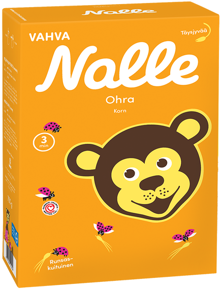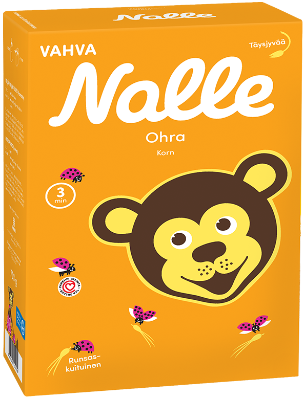 Ви можете приготувати кашу з цільнозернових пластівців Nalle Ohra всього за 3 хвилини. Цільнозернові каші містять хороші вуглеводи та велику кількість клітковини, яка сприяє роботі кишечника. Вміст клітковини 11%.