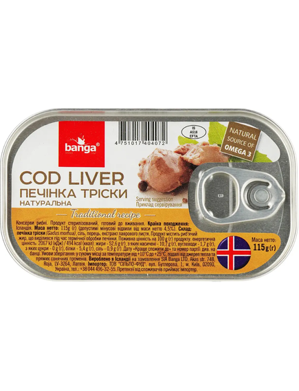 Печінка тріски Banga Натуральна, 115 г – це високоякісний делікатес, який поєднує в собі насичений смак і корисні властивості. Виготовлена з добірної печінки тріски, збереженої у власному соку, вона є ідеальним джерелом вітамінів і жирних кислот Омега-3.