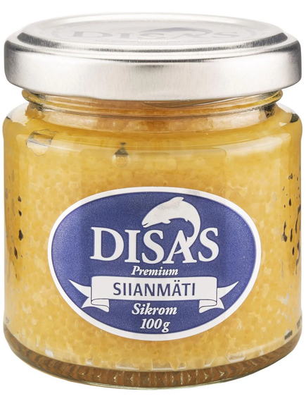 Ікра сига пробійна солона. Пастеризована. Склад: ІКРА СИГА* ПРОБІЙНА, сіль 3,5%, консерванти (Е202, Е211). *Сиг (Coregonus spp – РИБА), походження: Північна Америка.