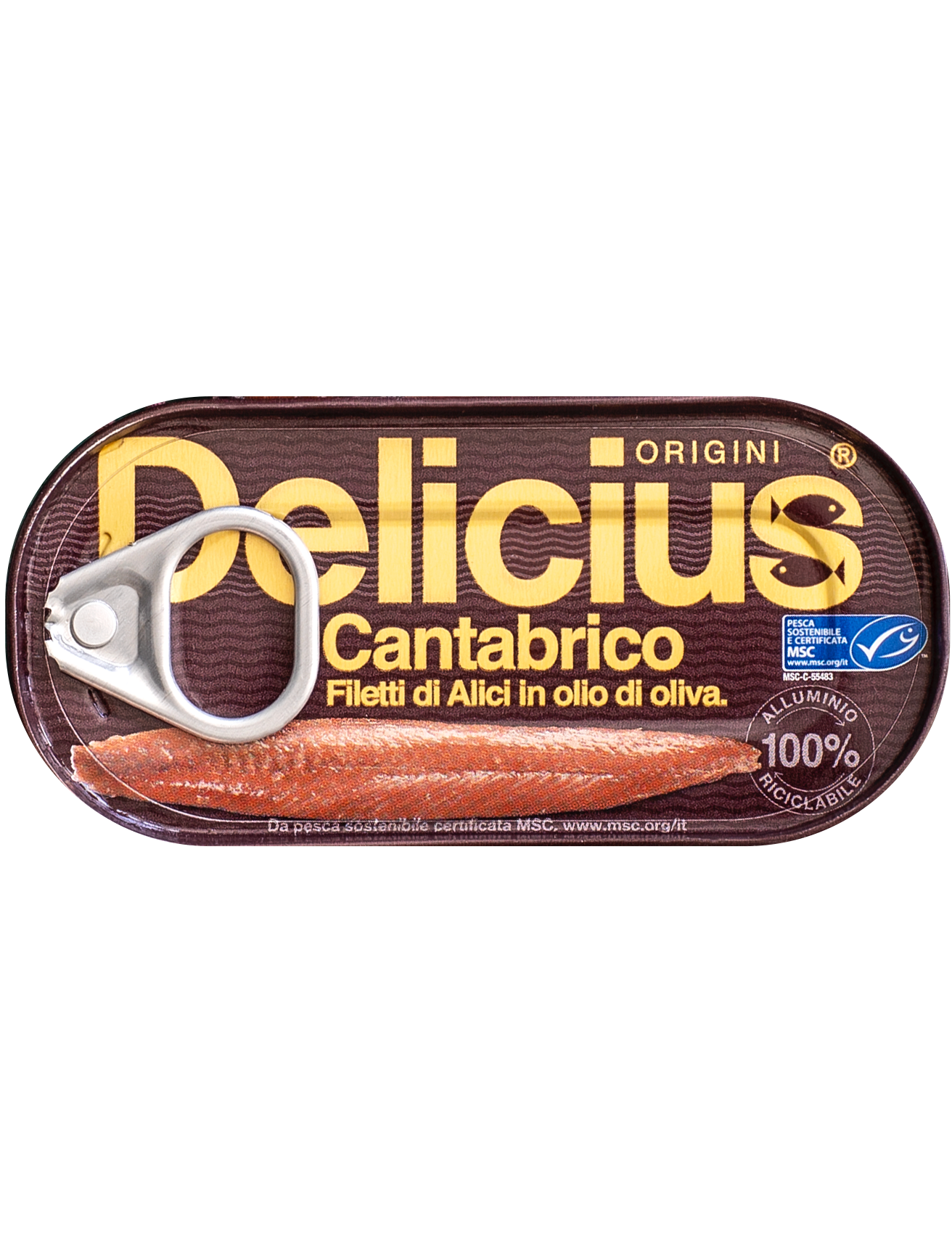Філе кантабрійського морського анчоуса, 28г. Анчоуси, виловлені в Кантабрійському морі, товсті та пікантні, мають злегка рожевий колір і більші за інші філе анчоусів. Практична одноразова форма робить їх ідеальними для будь-якого випадку, а упаковка на 100% придатна для вторинної переробки, що робить їх гарним продуктом як на смак, так і для планети.