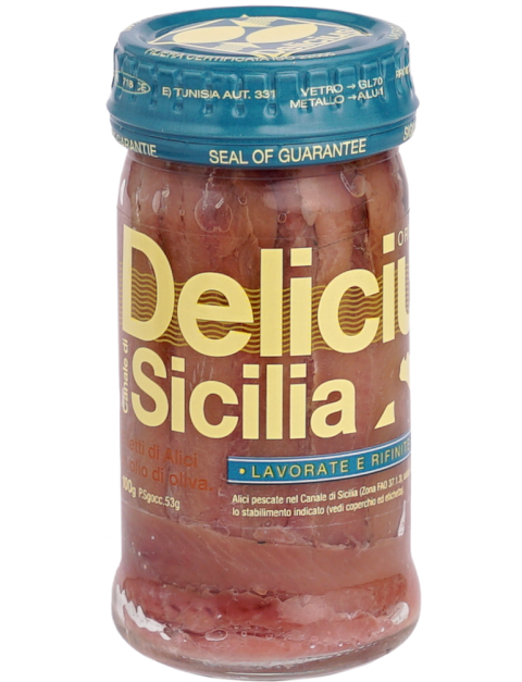 Філе анчоусів Сицилійської протоки в оливковій олії 100г. Анчоуси, виловлені на цій ділянці моря, мають ніжну консистенцію, і їх можна розпізнати за інтенсивним рожевим кольором і типовим і стійким запахом.