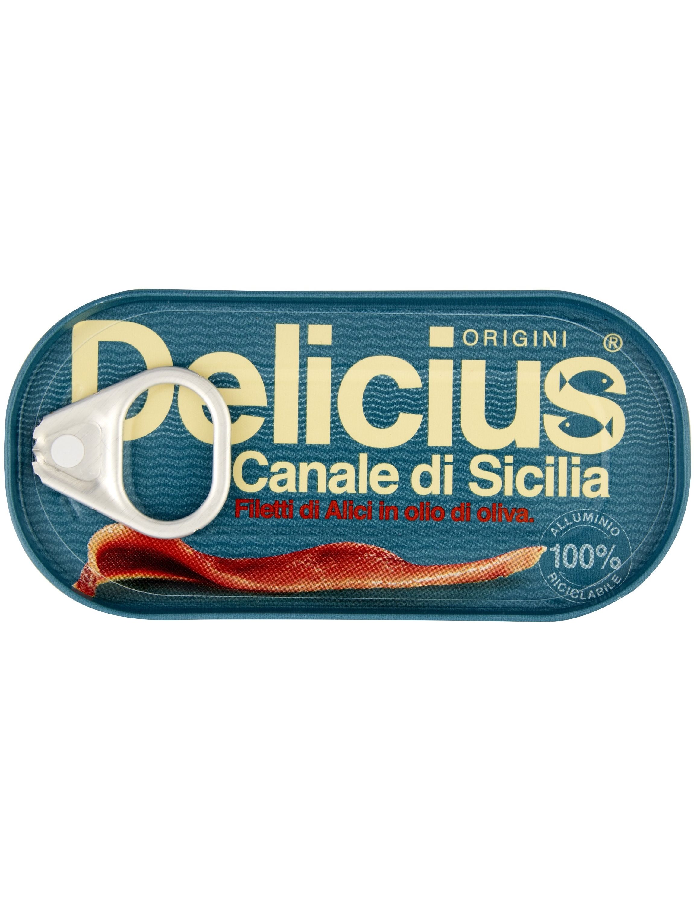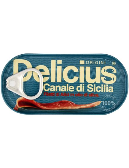 Філе анчоусів Сицилійської протоки в оливковій олії 28г. Анчоуси, виловлені на цій ділянці моря, мають ніжну консистенцію, і їх можна розпізнати за інтенсивним рожевим кольором і типовим і стійким запахом. Практична одноразова форма робить їх ідеальними для будь-якого випадку, а упаковка на 100% придатна для вторинної переробки, що робить їх гарним продуктом як на смак, так і для планети