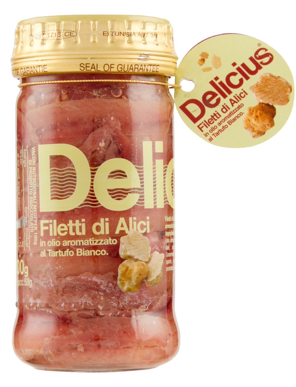Інтенсивний аромат білого трюфеля , справжньої досконалості італійської гастрономії, збагачує ці анчоуси Delicius їхнім безпомилковим смаком і робить їх ще більш особливими та унікальними.