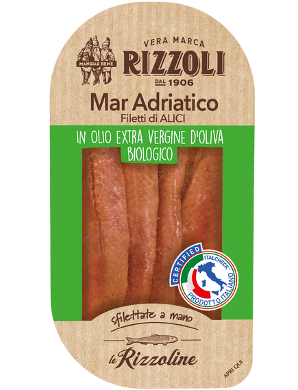 Філе анчоусів, виловлене у відкритому морі, збережене в органічній олії першого віджиму, отриманої після першого віджиму оливок, лише за допомогою механічного процесу та без втручання будь-яких процесів чи хімічних речовин.