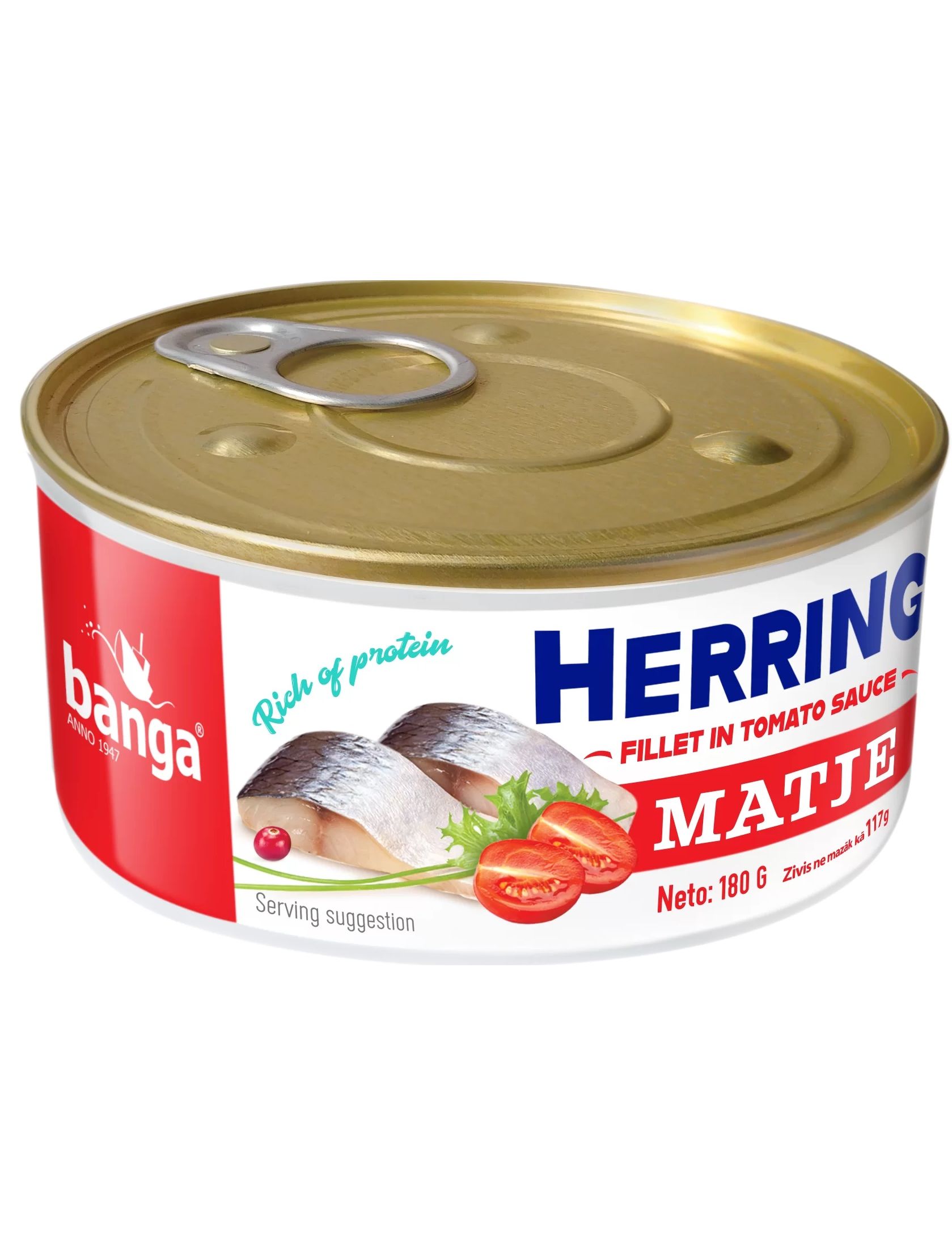 Філе оселедця Матіас Banga в томатному соусі 180 г — це смачна і корисна консервована риба, яка поєднує ніжне філе оселедця з насиченим томатним соусом. Томатний соус надає оселедцю кислуватий та пряний смак, який підкреслює природну текстуру риби. Розмір порції — 180 г, що робить цю страву чудовим варіантом для легкого обіду або вечері.