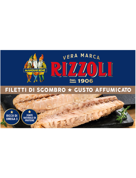 Копчене філе скумбрії Rizzoli, багате Омега-3 і природне джерело білків, готове до смаку та ідеально підходить для додавання вирішального штриха будь-якому рецепту.