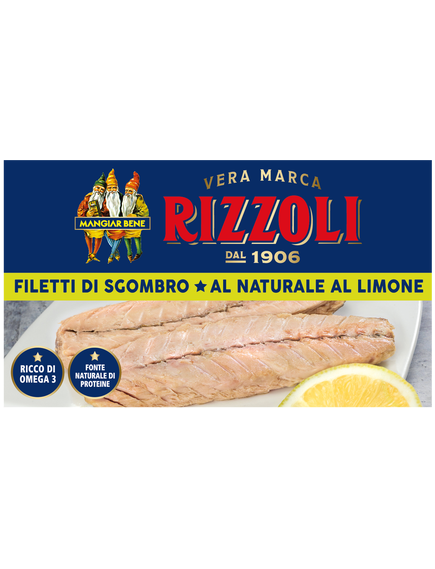 Філе скумбрії Rizzoli, виготовлене вручну на рибальському місці, згідно з традицією, залишають для дозрівання принаймні чотири місяці, а потім упаковують цілим і ідеальним із скибочкою лимона.