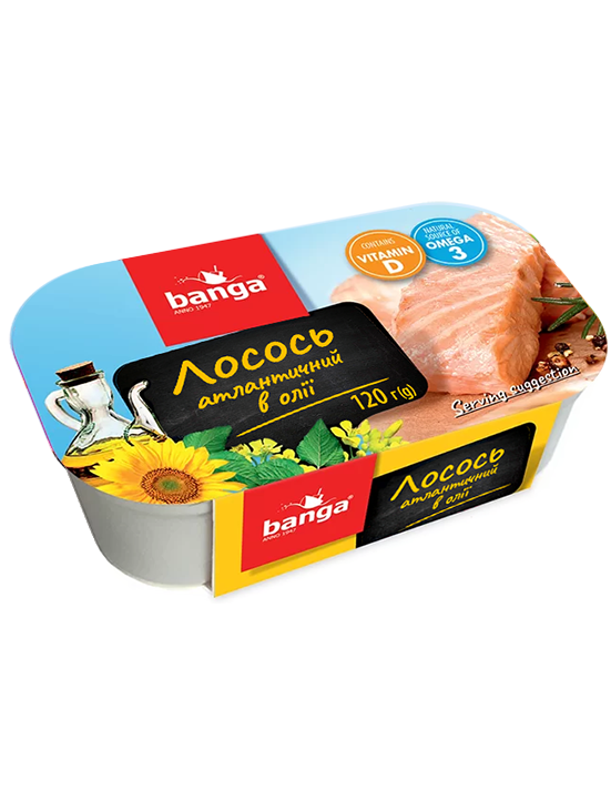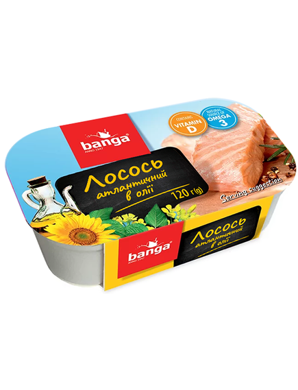 Склад: шматочки лосося атлантичного 70% (лосось Salmo salar, вирощений в умовах аквакультури в Норвегії, Шотландії), ріпакова олія 19%, сіль кухонна.