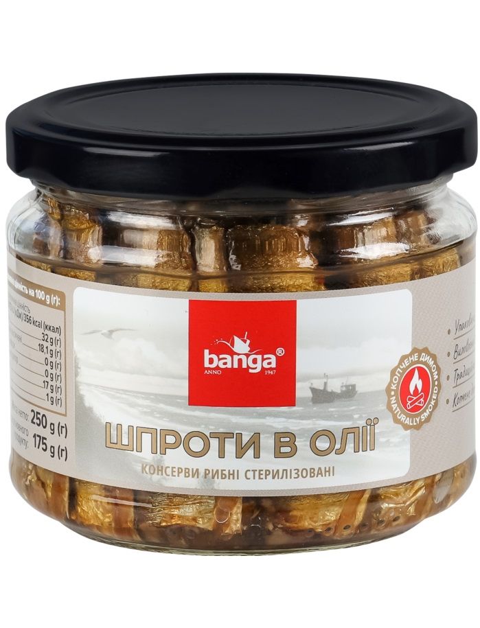 Склад: шпроти копчені 70%, ріпакова олія, сіль.
