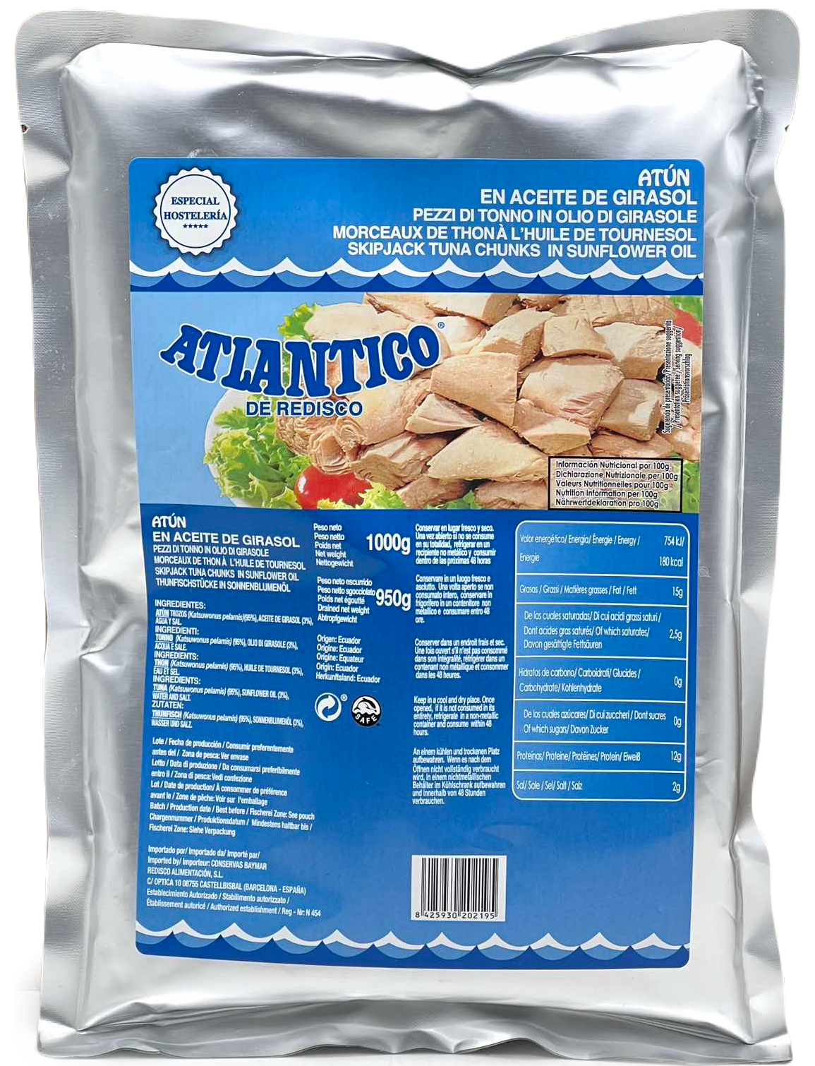 Цей продукт поставляється в пакеті вагою 1000 г, що робить його зручним варіантом для тих, хто шукає велику кількість тунця в соняшниковій олії.