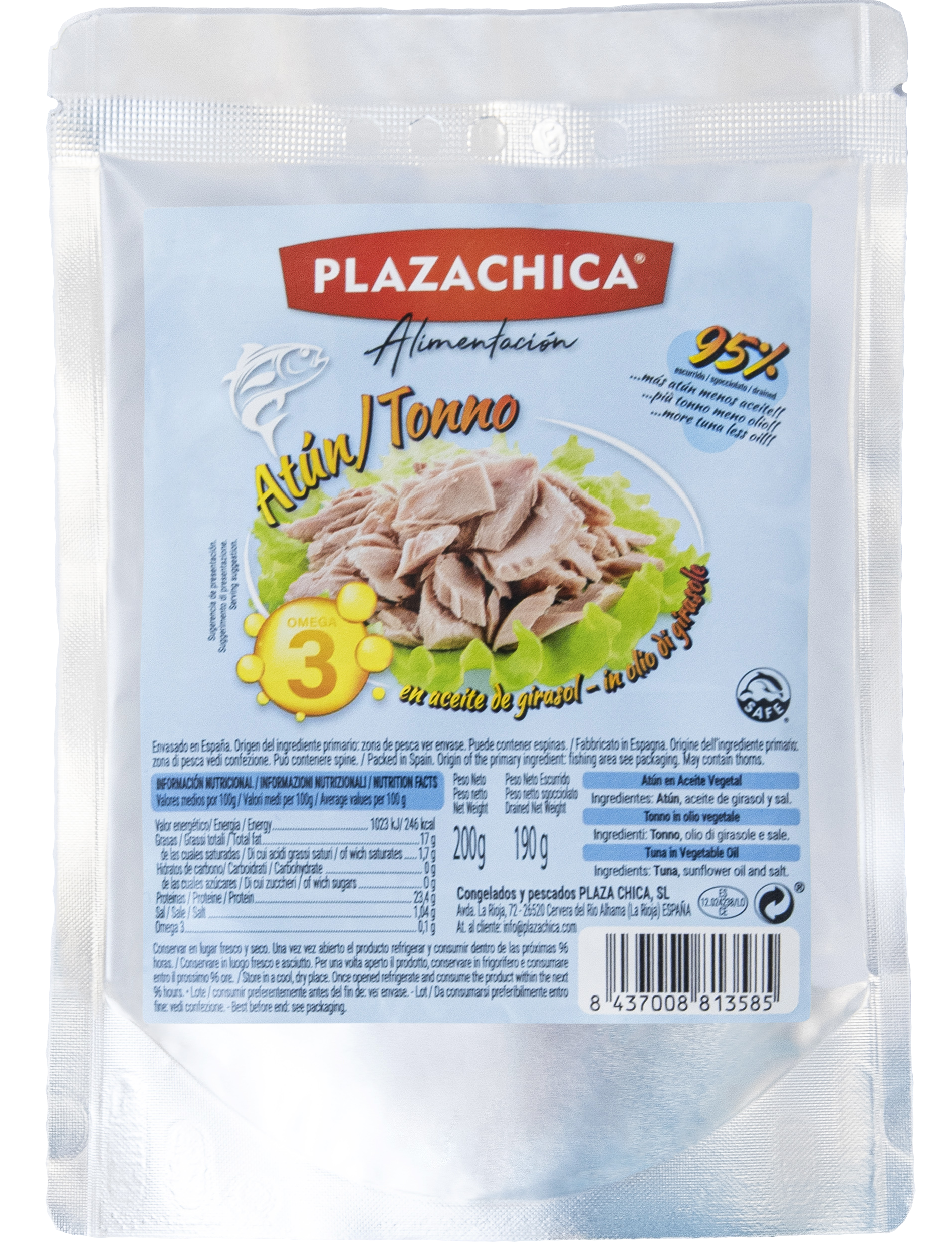 Вага тунця в соняшниковій олії: 200 г. Вага тунця суха: 190 г.