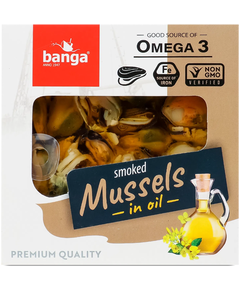 Склад: мідії копчені (Mytilus spp.) 60%, олія ріпакова 24%, сіль.