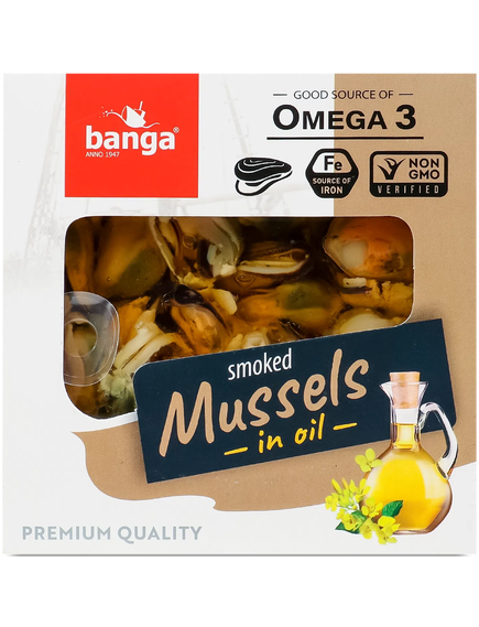 Склад: мідії копчені (Mytilus spp.) 60%, олія ріпакова 24%, сіль.