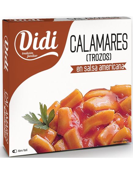 Кальмар Didi Calamares Trozos en Salsa Americana нарізані шматочками та доповненні соусом з ніжної американської томатної сальси і пікантним перчиком. Морський продукт за рахунок великої кількості томатного соусу дуже соковитий і з помірною гостринкою.