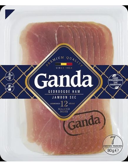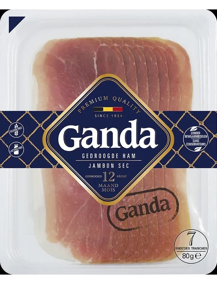 Шинка Ganda Ham на 100% бельгійська і на 100% натурально висушена. Це означає, що для його приготування використовуються лише три інгредієнти: бельгійська свинина, морська сіль і 12 місяців терпіння. Немає доданих консервантів, ароматизаторів чи барвників. Більше того, ця в’ялена шинка не містить глютену та лактози.