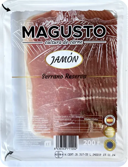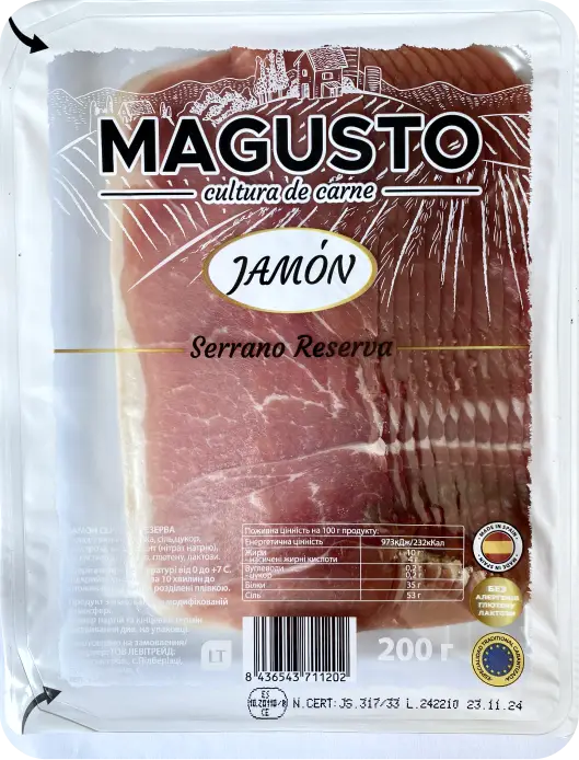 Мінімальна кількість для "Magusto Хамон Серрано Резерва нарізаний слайсами 200 г" є 3.