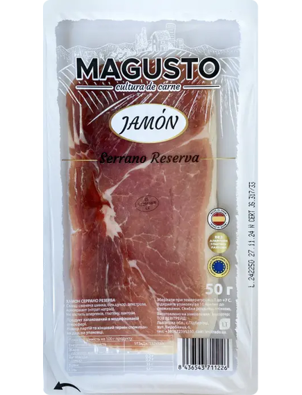 Мінімальна кількість для "Magusto Хамон Серрано Резерва нарізаний слайсами 50 г" є 5.