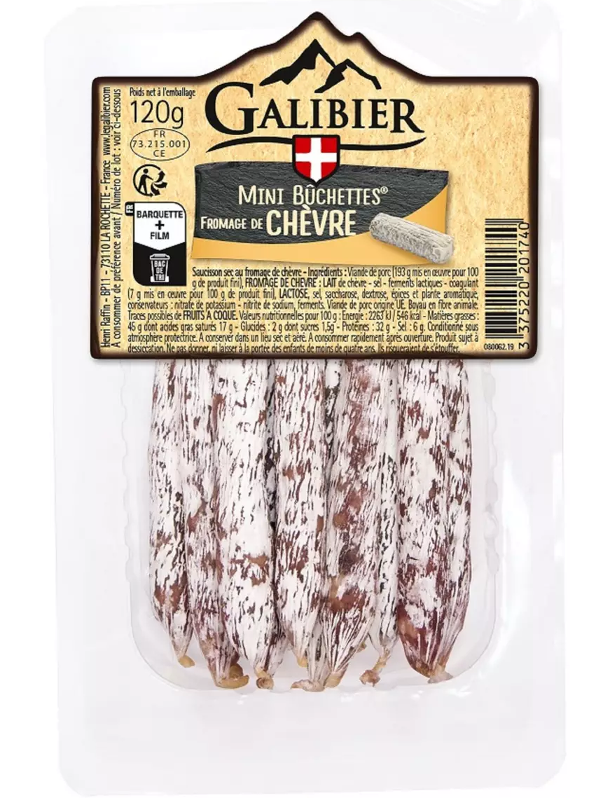 Ковбаса суха з козячим сиром: Інгредієнти: Свинина (193г на 100г готового продукту), Козячий сир: козяче МОЛОКО - сіль - молочнокислі ферменти - коагулянт (7г на 100г готового продукту), ЛАКТОЗА, сіль, сахароза, декстроза, прянощі та ароматичні речовини, натуральні ароматизатори, консерванти: нітрат калію - нітрит натрію, закваски, оболонки тваринного походження.