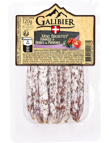 Міні-бушети з помідорами Herbes de Provence: Інгредієнти: Свинина (195 г на 100 г готового продукту), цукри (ЛАКТОЗА, декстроза, сахароза), сіль, помідори 1,2%, спеції, ароматичні рослини, в тому числі прованські трави 0,2%, ароматизатори (в тому числі МОЛОКО), консерванти: нітрат калію - нітрит натрію, закваски. Шланг із тваринного волокна