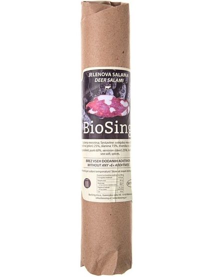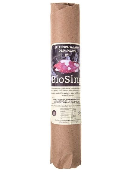 САЛЯМІ з оленини виготовлена зі свинини, оленя та бекону. М'ясо та бекон, ретельно відібрані, не подрібнюють, а нарізають кубиками, щоб зберегти достоїнства м'яса. Салямі дозріває не менше 18 місяців, щоб вивільнити великий букет ароматів і розвинути третинну ноту тривалого дозрівання.