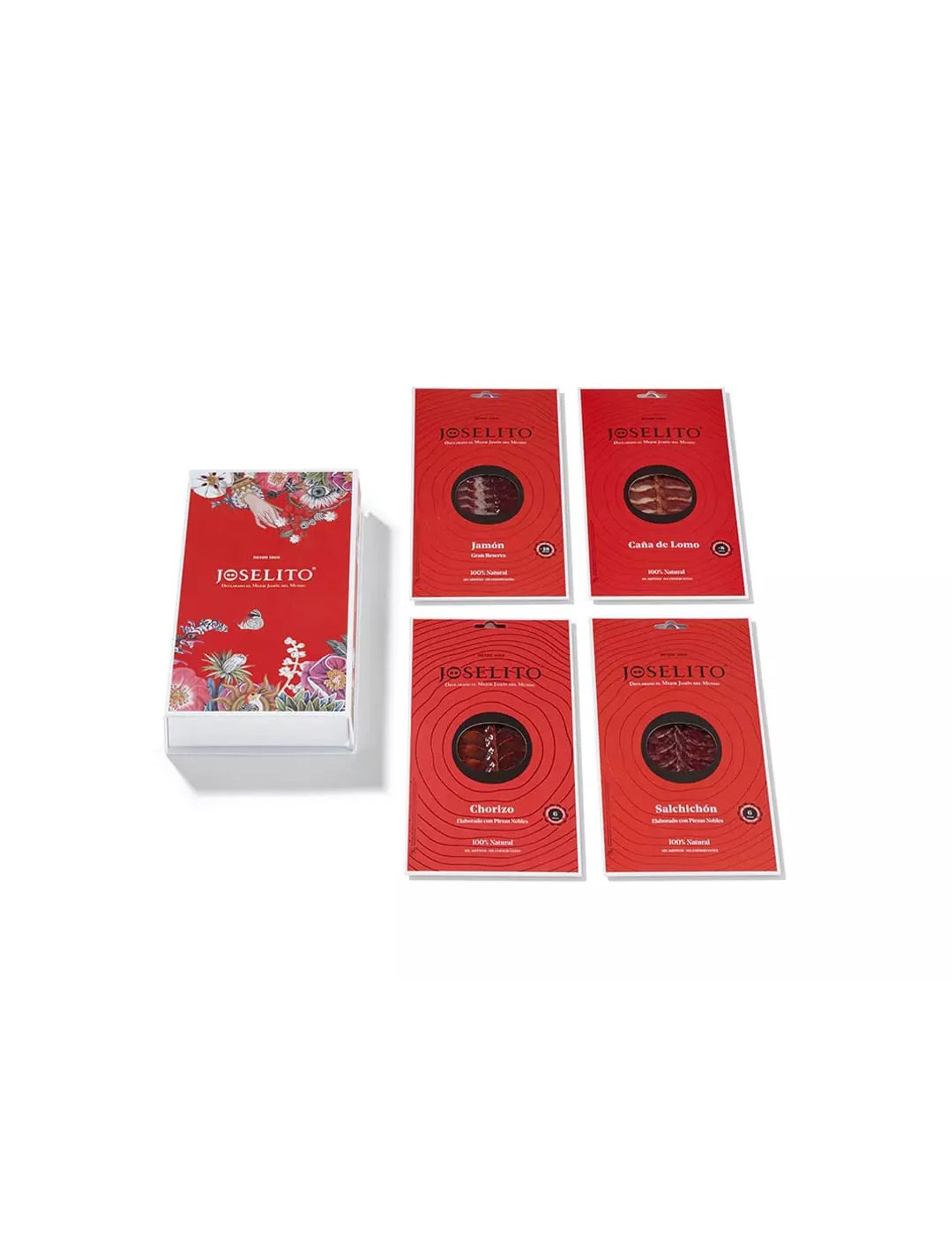 Ця дегустаційна добірка складається зі 100% іберійської шинки та містить чотири найкращі страви Joselito. До нього входить нарізана Хоселіто шинка Gran Reserva, нарізана Хоселіто Канья де Ломо (свиняча корейка), нарізана Хоселіто чорізо та нарізана сальчичон Хоселіто. Усе це попередньо нарізане в’ялене м’ясо має чудовий насичений смак із відмінною мармуровістю жиру, що надає їм м’яку кремову ніжну текстуру.