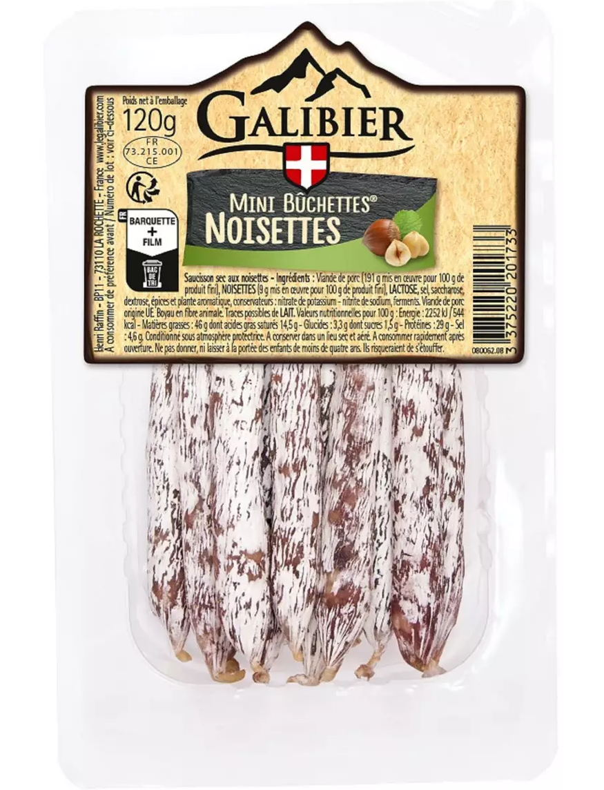 Ковбаса суха з лісовими горіхами. Склад: свинина (191 г на 100 г готового продукту), ФУНДУК (9 г на 100 г готового продукту), ЛАКТОЗА, сіль, сахароза, декстроза, прянощі та ароматичні рослини, натуральні ароматизатори, консерванти: калій нітрат – натрій нітрит, ферменти. Оболонки з тваринного волокна.
