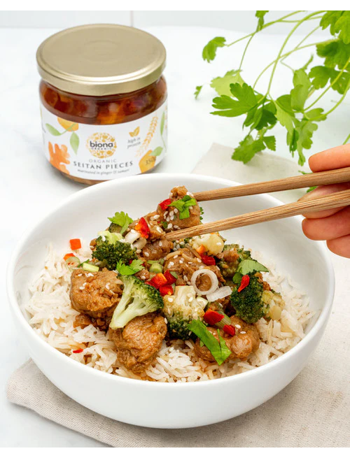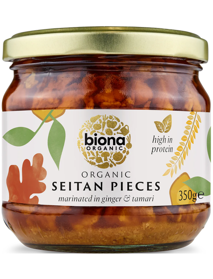 Сейтан є чудовим замінником м’яса та джерелом білка для веганів і вегетаріанців. Наші шматочки сейтану були замариновані в імбирно-соєвому соусі, тому вони готові до використання у ваших улюблених смажених стравах або салатах. Або посипте в сухарях, обсмажте у фритюрі або запікайте та подавайте як веганські нагетси!