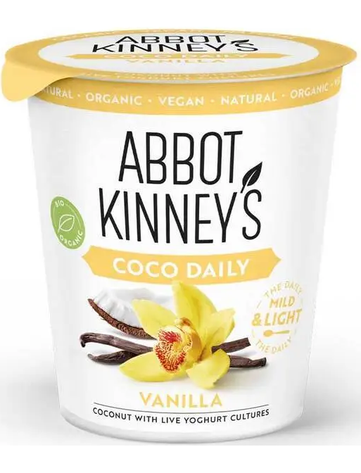 Abbot Kinney's Coco Daily Vanilla Organic 350 г — це органічний веганський йогурт на основі ферментованого кокосового молока з натуральним ванільним ароматом. Він має ніжну, кремову текстуру, приємний солодкуватий смак із ванільними нотками та є ідеальною рослинною альтернативою класичним молочним йогуртам. Продукт не містить лактози, глютену, штучних барвників та консервантів, підходить для веганів і тих, хто дотримується правильного харчування.