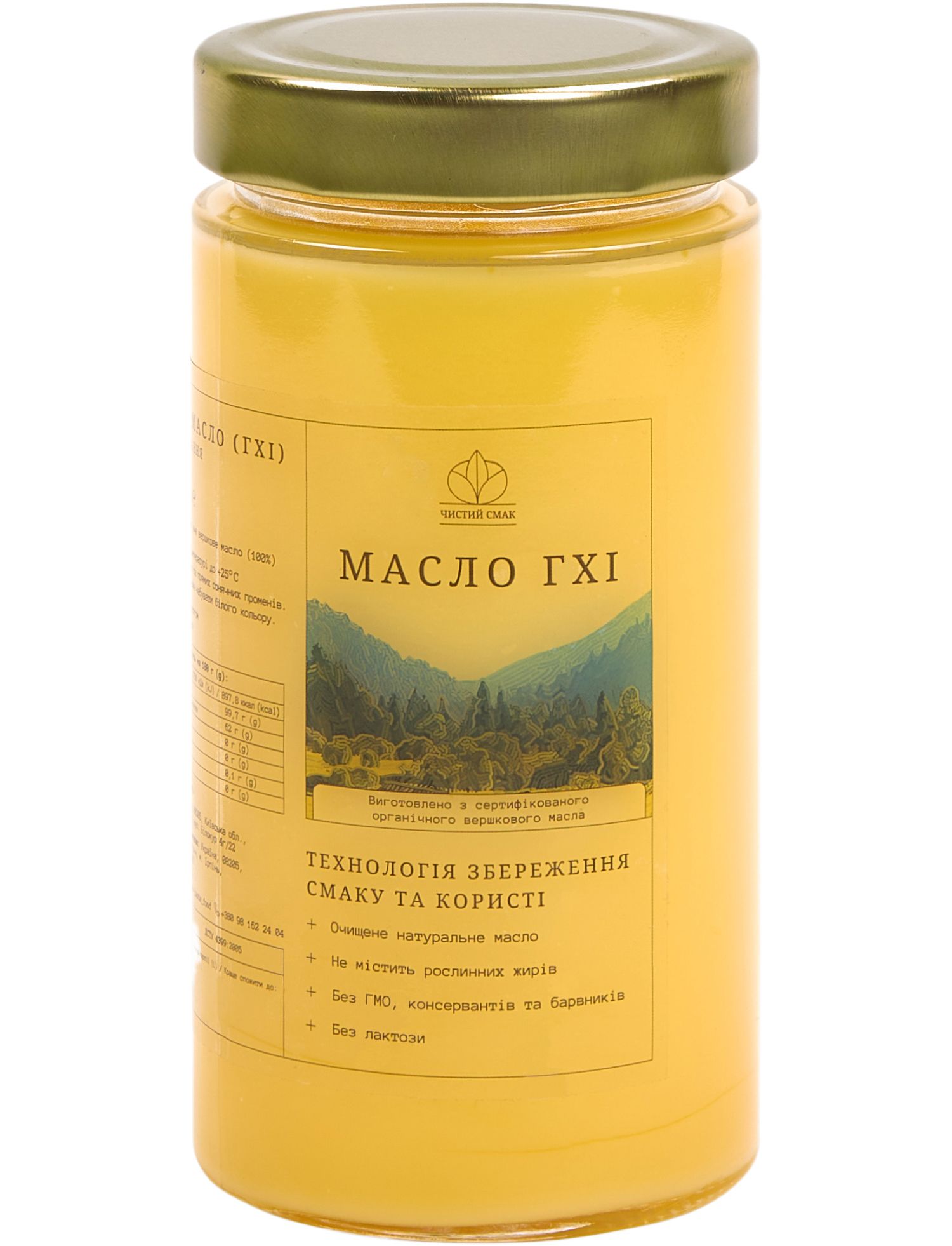 Масло ГХІ — чисте задоволення у кожній ложці. Ми готуємо його з якісного  органічного вершкового масла за технологією, яка прибирає з нього домішки, молочні білки, лактозу та воду, залишаючи в ньому тільки чисте масло молока з усіма його корисними властивостями та надаючи йому м'якого горіхово-вершкового смаку.