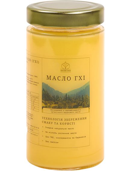 Склад: очищене сертифіковане органічне вершкове масло. Масло ГХІ — чисте задоволення у кожній ложці. Ми готуємо його з якісного  органічного вершкового масла за технологією, яка прибирає з нього домішки, молочні білки, лактозу та воду, залишаючи в ньому тільки чисте масло...