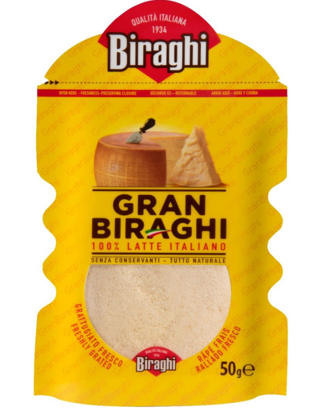 Свіжий тертий сир Gran Biraghi - це 100% італійський молочний продукт, повністю натуральний і без консервантів. Завжди свіжий завдяки упаковці, що зберігає свіжість, це найбільш продаваний продукт із найбільшим товарообігом у категорії тертої продукції (джерело: Circana). Безпосередньо від серця форми, він також доступний у великих форматах для більшої зручності.