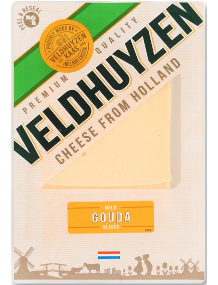 Скибочки сиру Veldhuyzen Gouda Cheese виготовлені з доступного та преміального м’якого сиру гауда з Голландії. Цей сир молодий/м'якої витримки з терміном дозрівання 4 тижні.